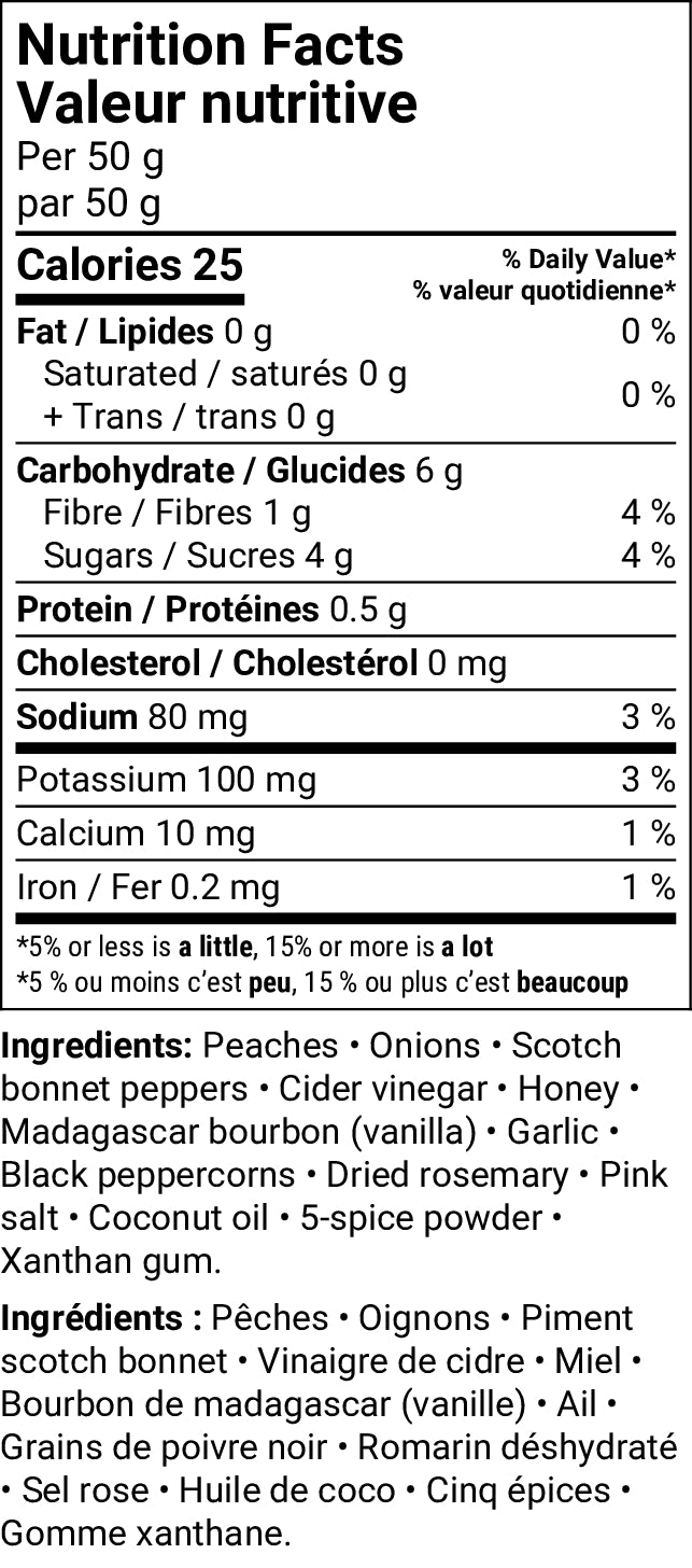 Ingrédients : Pêches • Oignons • Piment scotch bonnet • Vinaigre de cidre • Miel • Bourbon de madagascar (vanille) • Ail • Grains de poivre noir • Romarin déshydraté • Sel rose • Huile de coco • Cinq épices • Gomme xanthane